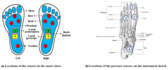 Locations of the sensors in the smart shoes: (a) a total of 12 sensors (6 sensors on the left and right shoe each) consisting of the pressure, accelerometer, and gyroscope sensors; (b) locations of the pressure sensors on the anatomical sketch: 1st metatarsal head (MH; sensor 1), toe (between the 1st and 2nd phalange; sensor 2), 4th metatarsal head (sensor 3), and heel (sensor 4).