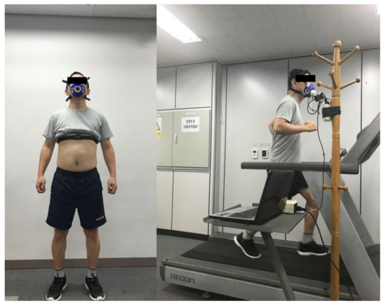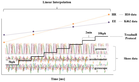 The participants wore shoes equipped with pressure, accelerometer, and gyroscope sensors in their stable states before the experiment. In addition, as shown in Figure 3, they wore an HR strap and a calorimeter for measuring the HR and EE, respectively. Each participant ran on an electric treadmill at a speed varying from 3 to 10 kph, which increased by 1 kph per every 2 min (total 16 min ran) and they were instructed to run at a constant speed as much as possible. Each shoe data type of the participants (gyroscope, accelerometer, and pressure sensor data), HR, and EE were simultaneously recorded during the experiment. The shoes data were obtained using a smartphone app at a sampling rate of 33.3 Hz, while the HR and EE were acquired using the K4b2 software and recorded when the participant exhaled.