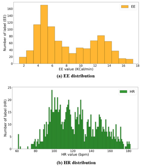 Distributions of HR and EE labels: (a,b) show the number of EE values per KCal/min and HR values per bpm, respectively.