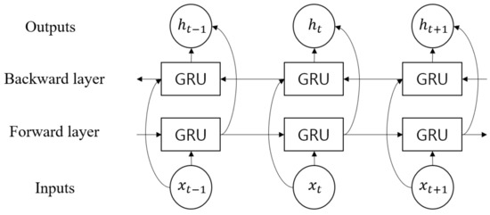 Bi-GRU could simultaneously utilize both the past and future information, creating more useful features than unidirectional GRU. This is implemented as a forward and backward layer, as shown in Figure 9. The final output of Bi-GRU is determined by the concatenation of the two vectors when the forward and backward hidden vectors are represented as and , respectively: