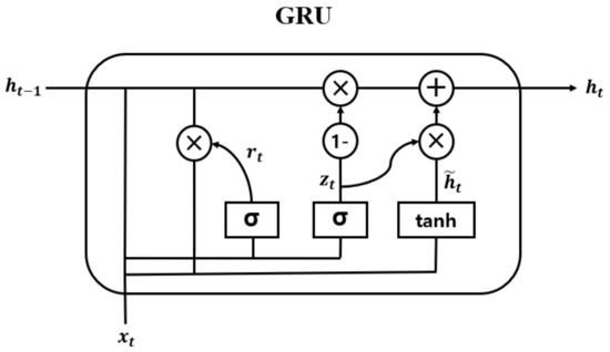 The hidden vector of Bi-GRU, , was obtained from , where is the size of the hidden unit of the GRU, as shown in Figure 9. Moreover, the internal structure of the GRU cell is shown in Figure 10. The operation is elaborated as follows: