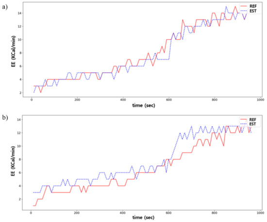 Comparison between the predicted (EST) and ground truths (REF) in EE estimation: (a) is the best case; (b) is the worst case.