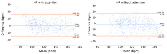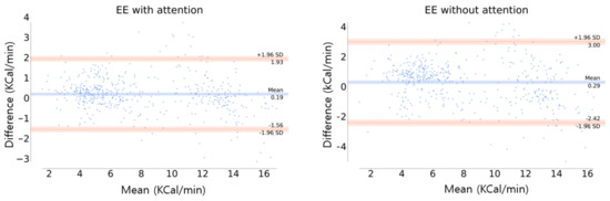 In Figure 12, the orange line is the limit of agreement (LOA), which means that the difference between the actual and estimated values is within the range of [lower LOA, upper LOA]. At the 95% confidence interval , in this study, the LOA was [−1.56, 1.93] and [−2.42, 3] in the model with and without the channel-wise attention, respectively. The distribution of the difference values was more concentrated around zero in the model with the attention than the model without attention, indicating the superiority of the channel-wise attention model. In addition, the mean differences between the actual and the estimation (blue line in Figure 12) were 0.19 and 0.29 for the models with and without the attention, respectively. This indicates the high accuracy of the attention model, which means that this model has little bias compared to the model without attention.