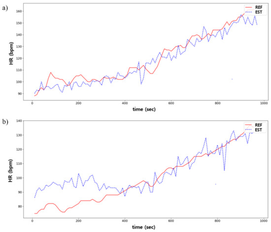 Comparison between predicted (EST) and ground truths (REF) in HR estimation: (a) is the best case; and (b) is the worst case.