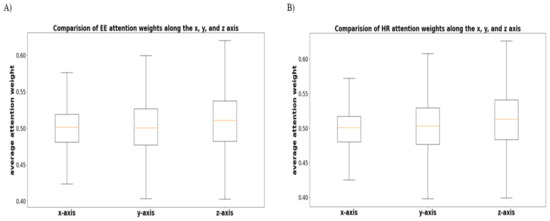 Comparison of the average attention weights for each of the x, y, and z axes. (A,B) illustrate the result of EE and HR, respectively.