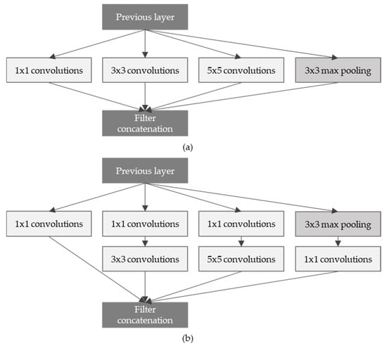 (a) Architecture of Inception module in the naïve version, (b) Architecture of Inception with dimensionality reduction in the Inception module.