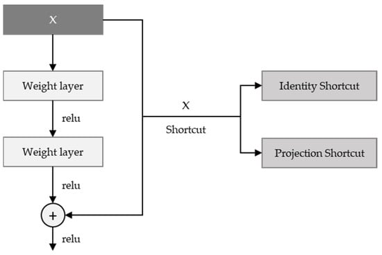 ResNet [23] took first place in the ILSVRC 2015 competition with the structure proposed by Microsoft Research. It has a structure similar to VGG, in that the 3 × 3 convolution is repeated. It is classified into ResNet-18, ResNet-34, ResNet-50, ResNet-101, ResNet-152, etc., according to the number of layers. There is a shortcut to the side of the two convolution layers, which is usually an identity shortcut—i.e., adding the input feature map to the output. Whenever the number of output feature maps is doubled, a method of reducing the width and length of the feature map by half is used; and instead of pooling, a convolution operation with stride = 2 is used. In this paper, ResNet-50 is applied, and since the number of feature maps increases in models over 50, the bottleneck structure seen in the inception module is applied to overlap the bottleneck residual block, as shown as Figure 3
