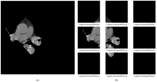 (a) Cardiac segmented images, and (b) cardiac cropped images created by dividing the segmented cardiac images into 9.