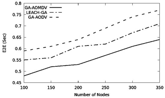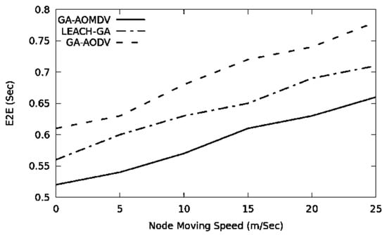 The network topology is subjected to frequent change where there is nodal mobility. With a higher mobility speed, the topology changes more often; therefore, the performance degrades due to a higher chance of link failure. In Figure 8, the end-to-end delay increases with the higher mobility speeds. Every time a link fails to deliver data, the GA-AODV goes through the route discovery phase. Therefore, the data packet should remain in the queue link until a route is discovered. On the other hand, LEACH-GA has to go through cluster head selection more frequently. Therefore, data senders should adapt to the new cluster head, which increases the delay.