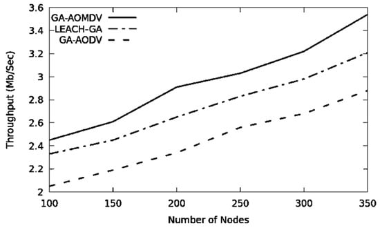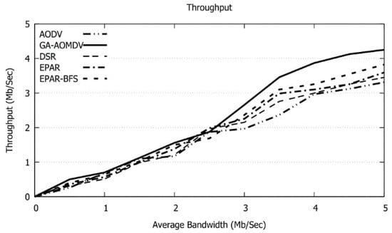 In Figure 18 with a wider bandwidth range, more data packets can be transmitted. Our protocol selects nodes that have higher residual energy. Therefore, passing through nodes that might die particularly during the data communications, because of a lack of energy, will be avoided and hence this enhances the throughput. GA-AOMDV achieves a gain in throughput with a range of 9% to 20% over other protocols.