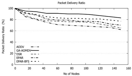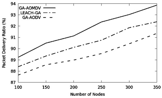 In Figure 13, GA-AOMDV outperforms other protocols. Our mechanism returns an array of energy-efficient routes so, in case of a link failure, alternative routes are always available without the need to go through the route discovery phase. When increasing the number of nodes particularly more than 40, more traffic problems such as congestion and data collision may arise and as a result, a lower amount of data is delivered to the final destination successfully. GA-AOMDV achieves a gain in packet delivery ratio with a range of 7% to 27% over other protocols. To better understand the gain in the packet delivery ratio that our method can achieve compared to other protocols, we present in Table 5 the data for results shown in Figure 13. Applying (5) produces positive values which indicate the gain in the packet delivery ratio obtained through using GA-AOMDV.