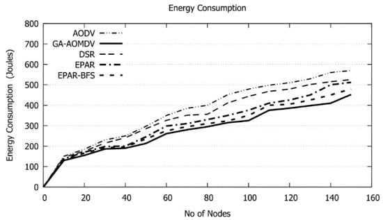 When the number of nodes increases beyond 40, the AOMDV route discovery phase in addition to the GA process will take a longer time resulting in producing additionally available routes. Moreover, when a channel disconnects or a node fails, triggering alternative route is processed. In all these cases, an excessive amount of energy is consumed as shown in Figure 12. However, GA-AOMDV has the minimum used energy as other efficient routes likely exist whenever are needed. We can observe that GA-AOMDV lessens the energy consumption with a range of 6% to 35% over other protocols. To better understand the saving in the energy consumption that GA-AOMDV can achieve compared to other protocols, we present in Table 4 data for results shown in Figure 12. Applying Equation (5) produces negative values which indicate the energy saving.