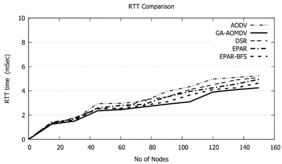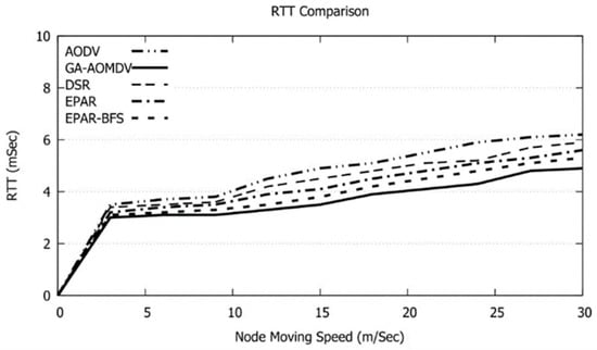 Mobility of the nodes results in routes disconnection. As a result, alternative routes should be optimized through the routes discovery process and this, in turn, would maximize the energy consumption. GA-AOMDV avoids such a process as other possible routes likely already exist. Accordingly, the used energy will be minimized as shown in Figure 19. On the other hand, having mobile nodes will increase the possibility of traffic problems and this, in turn, requires packets retransmissions. In this case, RTT augments with the node speed as shown in Figure 20.