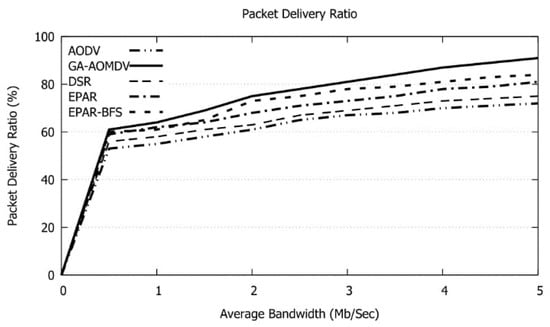 In Figure 15, when the bandwidth of the intermediate links increases, more data can be transmitted where our protocol achieves the best performance. GA-AOMDV gets a gain in packet delivery ratio with a range of 7% to 21% over other protocols.