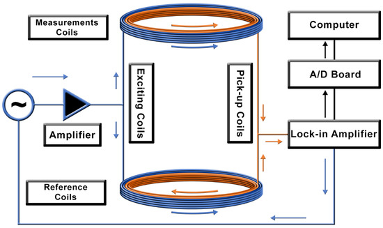 Schematic diagram of the Alternate Current Biosusceptometry (ACB) system. The blue arrows indicate the excitation windings of the coils, and the orange arrows indicate the pick-up windings of the coils.