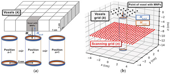 For quantitative 2D imaging, a discrete forward model for ACB is necessary. Thus, we discretize the problem, and consequently, the FOV is composed of K voxels. Hence, the voltage induced in the pick-up coil, generated by an MNPs mass () in the k-th voxel, can be calculated by Faraday’s law and has a final form as: