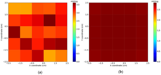 (a) Experimental and (b) calculated sensitivity maps at a distance of between the sensor and voxel surfaces. The Field of View (FOV) has , and each voxel presents . The maps were calculated by summing all the sensor’s signals (normalized by Magnetic Nanoparticles (MNP) mass) for each cube position in a voxel.