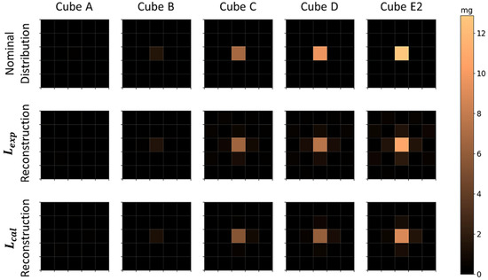 Nominal and reconstructed MNPs’ distribution for a single MNP loaded cube positioned in the center of the FOV. The first row shows the nominal MNP distribution, the second row and the third row show the reconstructions using and , respectively. Each column was obtained for an individual MNP cube of different MNP mass (MNP mass increases in ascending order). Physical non-plausible negative MNP masses due to the reconstruction algorithm are not shown.