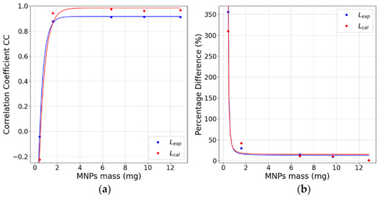(a) CC values for reconstructing one cube in the FOV’s center. (b) values for the reconstruction of one cube positioned in the FOV’s center. All graphs present the values for all MNP masses used. Fitted curves presented .