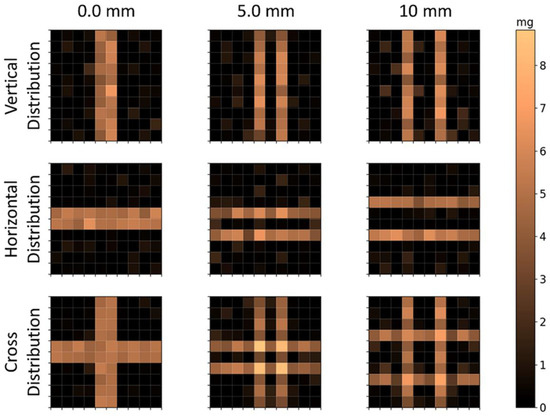 Reconstructed distributions of MNP loaded bars’ calculated signal. Note that lower voxels were used in the same FOV of , for a total of 100 voxels of . The first row shows the vertical distributions; the second row shows the horizontal distributions; and the third row shows the cross distributions. The columns indicate the distance between the bars’ surfaces.