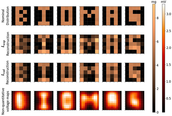 The reconstruction of the MNPs’ distributions of several cubes arranged to form the letters B, I, O, M, A, and G can be seen in Figure 8. As shown in Table 4, all letters for and presented high correlation values and low relative error in quantification and no significant differences between experimental and calculated methods. The voltage maps of letters’ distributions shown in Figure 8 (fourth row) are based on voltage intensity distributions, detected by the sensor in the respective positions. In comparison to the voltage maps, the inverse problem reconstructions presented a better spatial resolution, because they solved the letters’ geometries, and also allowed a quantitative analysis.