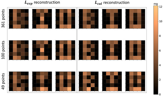 To assess the influence of the number of scanning points (i.e., the number of coils in the forward problem), the letters’ distributions were reconstructed and evaluated with a horizontal and vertical grid step of , , and , to obtain 361, 100, and 49 grid points, respectively. All of these matrices presented the same voxel, scanning grid, and FOV geometry and sizes.