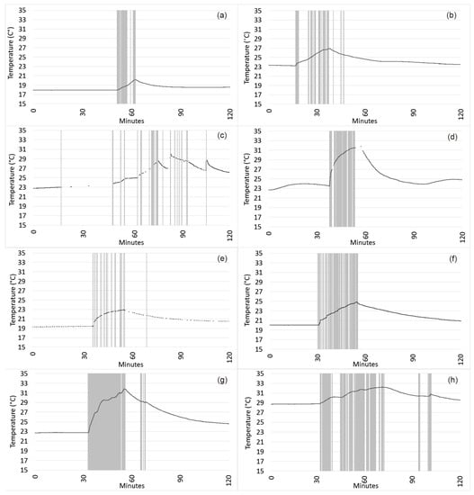 One graph from each participant to display the beacon sensor data for longitudinally collected temperature (black line) and motion, represented by the grey vertical lines, for one diary-logged period for magnifier use, along with additional time shown immediately preceding and subsequent to the magnifier usage. (a) Subject 1 reported using the magnifier for 10 min, when the beacon sensor recorded 109 instances of motion and a total temperature increase of 2.25 °C. (b) Subject 2 reported using the magnifier for 30 min, when the beacon sensor recorded 209 instances of motion and a total temperature increase of 3.7 °C. (c) Subject 3 reported using the magnifier for 30 min, when the beacon sensor recorded 196 instances of motion and a total temperature increase of 4.6 °C. (d) Subject 4 reported using the magnifier for 20 min, when the beacon sensor recorded 230 instances of motion and a total temperature increase of 8.3 °C. (e) Subject 5 reported using the magnifier for 20 min, when the beacon sensor recorded 372 instances of motion and a total temperature increase of 3.5 °C. (f) Subject 6 reported using the magnifier for 24 min, when the beacon sensor recorded 193 instances of motion and a total temperature increase of 4.8 °C. (g) Subject 7 reported using the magnifier for 90 min, when the beacon sensor recorded 468 instances of motion and a total temperature increase of 8.8 °C. (h) Subject 8 reported using the magnifier for 40 min, when the beacon sensor recorded 447 instances of motion and a total temperature increase of 3.4 °C.