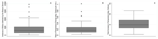 Box plots to show the distribution of the beacon sensor data across all subjects for: (A) the number of instances of motion per magnifier use, (B) rate of temperature change and (C) total temperature rise during each magnifier use. In the box plots, the bottom and top of the box are the 25th and 75th percentile (i.e., the upper and lower quartiles, respectively), and the band near the middle of the box is the 50th percentile (i.e., the median). The ends of the whiskers represent the lowest datum within 1.5 times the interquartile range of the lower quartile and the highest datum still within 1.5 times the interquartile range of the upper quartile. Outlier data are represented by individual dots.