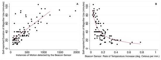 The self-reported duration of magnifier use in the diary logs (mean 42 min; SD 24, range 10–105 min) was significantly correlated with: (1) the number of instances of motion recorded by the beacon sensor (i.e., self-reported magnifier use increased by 4.4 min, on average, for every 100 instances of detected motion; 95% CI: 2.6, 6.1; p < 0.001; Figure 3A) and (2) the mean linear rate of temperature increase measured by the sensor (i.e., self-reported magnifier use decreased by 19.0 min, on average, for every 0.1 °C per minute temperature increase when the rate of temperature increase was <0.3 °C per minute; 95% CI: 9.3, 28.6; p < 0.001; Figure 3B; although, there was no statistically significant linear relationship with the amount of beacon sensor-recorded motion when the rate of temperature increase was >0.3 °C per minute, displayed in Figure 3B).