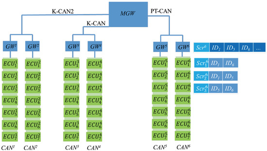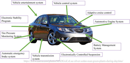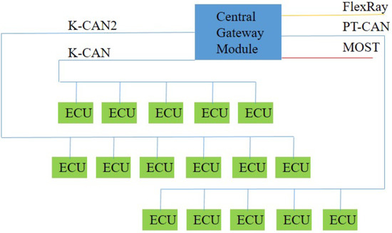 Automotive architecture systems have become increasingly complex and diverse. In response to people’s demands related to automotive safety, comfort, and entertainment systems, numerous electronic components have been added to vehicles. Conventional end-to-end communications are no longer adequate for the effective management and use of these devices, and in-vehicle networks have gradually become mainstream. An in-vehicle network comprises vehicles outfitted with multiple interconnected processors, coordinating tasks, and shared messages. An automotive bus is the communication network that interconnects underlying automotive devices or automotive instruments in the in-vehicle network [1]. Currently, four mainstream automotive buses are used: Controller Area Network (CAN bus) [2], Local Interconnect Network (LIN) [3], FlexRay [4], and Media Oriented Systems Transport (MOST) [5]. These four automotive buses have different transfer speeds and characteristics on the basis of various applications and requirements. Modern cars are typically equipped as follows, shown in Figure 1.
