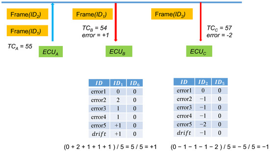 compares the MACs using the aforementioned method in the following order: , and so on until reaching and , where n is the set threshold that can be adjusted on the basis of usage requirements and security. We named this job error. Furthermore, a time offset value, , was set with an initial value of 0. After several errors are collected, is set to the average of the errors as the baseline for the subsequent message synchronization. Figure 6 explains the drift storage. When its own time counter is 55, sends out a frame, and when receives the frame, its own time counter is 56. At this time, = 56 will not result in a successful authentication, and therefore, will begin testing by using to calculate the following: