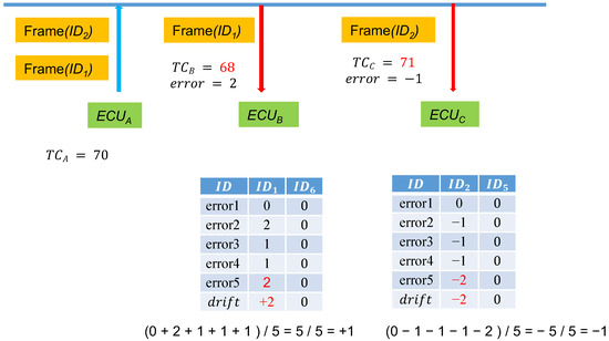 In the proposed system, the value was set to 1 s. Therefore, in the poorest comparison scenario (i.e., the error value is ), the range of the time error between the two ECUs is 2n + 1 seconds.