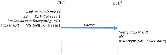 - Initial distribution of keys. After the gateway resets the time counters to zero, it generates a seed used to create group keys. The gateway then uses this seed to create a MAC for the group key shared with every ECU in advance and then broadcasts the MAC to each ECU.
