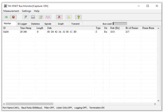In addition, we also added attack packets and passed them into our experimental module to simulate denial of service attacks. We send normal packets and attacks packets into the network without orders, and uses the build-in monitoring software NI-XNET BUS Monitor to monitor all packets on the CAN BUS, as shown in Figure 20.