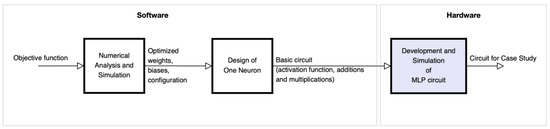 From the optimized model of the ANN, we carried out the CMOS circuit design based on the operational amplifier to design the base cell called perceptron, which is commonly used in multi-layer perceptron (MLP) architectures. Figure 1 shows the block diagram of the proposed methodology for the development of the circuit. Block 1 represents the numerical analysis stage and the simulation of the optimization of the objective function (obtaining synaptic weights and bias) for the ANN, based on gradient. Block 2 is focused on the design of the base neuron (perceptron) at the circuit level. Finally, block 3 shows the development and simulation of the complete MLP circuit to obtain the neural network behavior proposed in the case study.