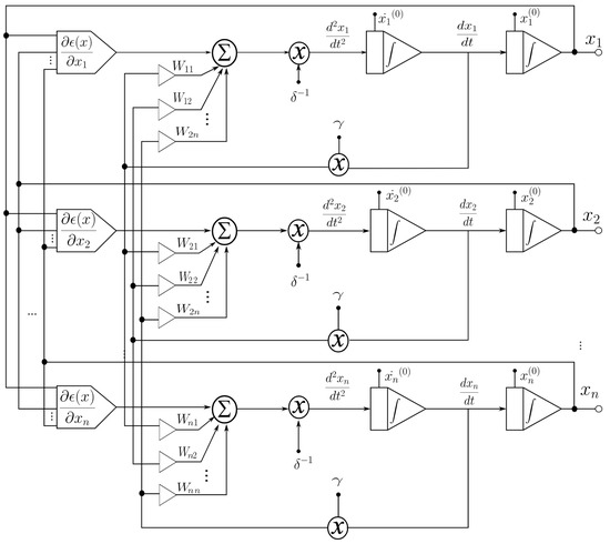 Figure 2 shows the block diagram for the function, which consists of two continuous-time integrators (whose response depends on the feedback network), one analog multiplier, one summing amplifier, and one non-linear function generator for calculating the gradient of the objective function at the circuit level. The optimized parameters are the output signals of the integrator. This circuit is characterized by having a more robust output (insensitive to small perturbations) with respect to the parameter variation. The function generator is the only one that precisely calculates the gradient of the objective function.