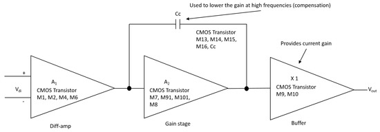 Figure 6 is, in detail, the block diagram of the 1.2 m technology operational amplifier in Figure 4 that shows the operational amplifier with CMOS transistors, formed by the stages of a differential amplifier (M1, M2, M4, and M6), gain stage (M7, M91, M101, and M8) and the output stage (buffer) (M9 and M10). Compensation network M13 and capacitor Cc, where M13 is made up of a polarization network by the transistors M14, M15, and M16. The dimensions of the main semiconductor N-channel and P-channel transistors are listed in Table 4. The characteristic values of the integrator are described in Table 5 [18,19].
