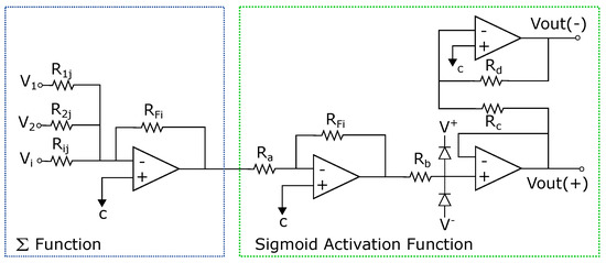 The complete circuit of the analog neural network is shown in Figure 3, where the inputs , the weights (defined by the resistors ), and the activation functions ( and F) are represented. The basic circuits that correspond to the analog neural network neurons are the inverting amplifiers and the activation function. The inverting amplifier circuit is used as a summation block. Hence, when many input voltages are connected to the inverting input terminal, the resulting output is the sum of all the input voltages applied, although inverted; this output, combined with the feedback resistor, generates the multiplication by a weight. The circuit for implementing a neuron is shown in Figure 7, where the function computes multiplications and the activation function is a [19].
