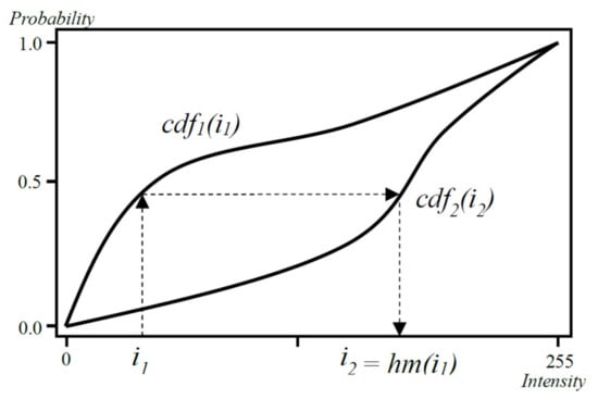 An example of histogram matching: cdf1 and cdf2 are the cumulative distribution function, i1 is the input intensity, and i2 is the output one.