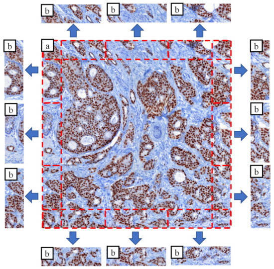 Patched based overlap division: (a) original tile; (b) patches extracted from overlap areas (4 × 3 patches); red lines: patches.