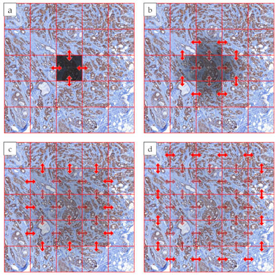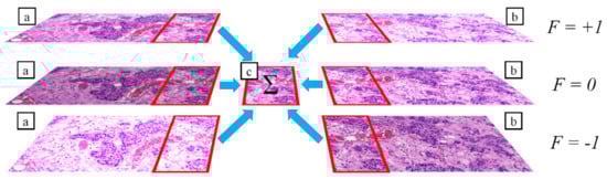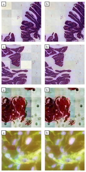 The images that come directly from the scanner camera output channel contain FOVs presenting heterogeneous intensity even though they were recorded with the same exposition time. This inhomogeneity originates from the structural heterogeneity of the tissue sample and from the optical features of the scanner hardware, such as the rapid stage movement, complex optical path or the camera and illumination characteristics [8,9,10]. Therefore, next to the image stitching process, an intensity compensation is needed. However, there are some special requests related to this compensation task. The scanning time is a critical point because the diagnostic time is limited in the pathology department: while the available expert pathologists are limited, the number of the samples increase dynamically. Accordingly, both the image quality and scanning time are critical points. This situation needs an ultrafast scanning system, to create the digital slide without any delay in an appropriate quality. Stitching operation should be fast-processing with minimal use of the available system resources.