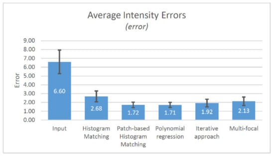 Examining the errors between the focal layers (Figure 11), the input images had value of 4.39. It is more than twice as applying histogram (2.26), patch based (2.16), regression based (2.08) or iterative (2.11) approaches. However, the multi-focal optimization gave the best results (1.14) for z-error.