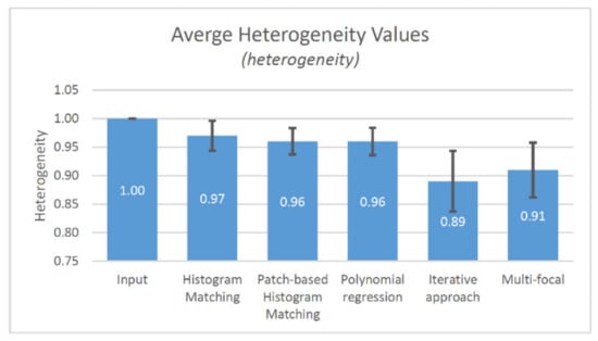 Analyzing the heterogeneity (Figure 10), we can see that except the iterative approach (0.89) the other methods give almost the same results (0.9×). It is not surprising; the iterative approach was made to eliminate the inter-tile heterogeneity. We use five iteration steps for the validation set. The number of needed iterations is greatly determined by the characteristics of sample, since using lower iteration number, the compensation is not able to compensate a local unevenness, but applying larger iteration count the possibility of compensating the not related tissue areas to each other are increasing. For the validation set five iteration is enough.