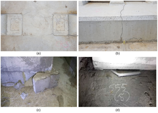 Typical cracks and damages in concrete slab tracks in Korea: (a,b) surface-breaking cracks in the continuous concrete slab track in a high-speed railway system in Korea and (c,d) damages in precast concrete railway tracks in an urban subway system in Korea.