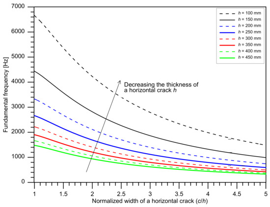 Variation of the fundamental frequency of the flexural virbation mode over a horizontal crack with normalized width (c/h, the width of a defect, c, normalized by the depth of a defect, h) and the thickness of a defect, h. Figure 4 was drawn based on the materials’ properites with Poisson’s ratio of 0.18 and P-wave velocity of 4000 m/s.