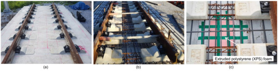 A real scale mockup model of concrete slab tracks in the Korea high-speed railway (KHRS) system used in this study: (a) a picture of a part of the concrete slab track specimen, (b) embedded items in the track concrete layer, TCL, concrete (precast concrete sleepers, lattice trusses, reinforcing steels and various inserts) and rails, (c) an extruded polystyrene (XPS) foam board located on the surface of hydraulically stabilized based course, HSB, to fabricate artificial debonding at the interface between TCL and HSB.