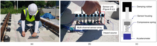 Impact-echo testing on the concrete slab track specimen using a multi-channel IE testing device: (a) IE testing on the concrete slab track specimen, (b) the multi-channel sensor array used in this study, and (c) a sensing unit in the multi-channel sensor array that is composed of an accelerometer, a sensor housing, a compressive spring, and a damping rubber.