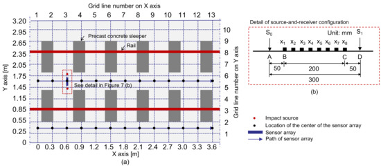 Test plan on the surface of solid concrete: (a) scanning procedure for multi-channel Impact-echo test and (b) source-and-receiver configuration.
