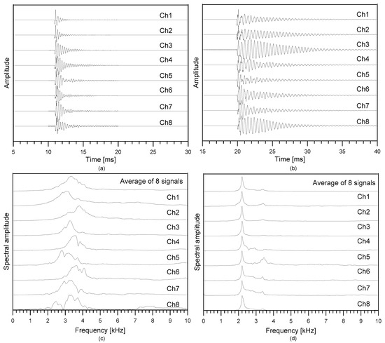 Figure 9a,b show typical time signals measured over the solid test region and the debonding defect in test region 3, respectively (see Figure 7 and Figure 8). A total of eight acceleration signals were measured by the multi-channel IE testing device at a single impact loading. The time signals in Figure 9a were measured by locating the middle of the sensor array at r = (xr, yr) = (1.8 m, 0.40 m) and the impact source at s = (xs, ys) = (1.8 m, 0.55 m). The time signals shown in Figure 9b were measured by locating the middle of the sensor array at r = (xr, yr) = (3.15 m, 1.6 m) and s = (xs, ys) = (3.15m, 1.75 m).