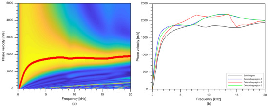 A resulting dispersion curve, , is presented as a red line in Figure 10a, which appears to match with the A0 Lamb mode. Figure 10b compares the dispersion curves extracted from the dispersion images obtained from the solid test region and three concrete regions over debonding defects 1, 2, and 3. It was noticed that the presence of the debonding defects increases the phase velocities in a frequency range of 5 kHz to 20 kHz compared to that of the solid concrete region.